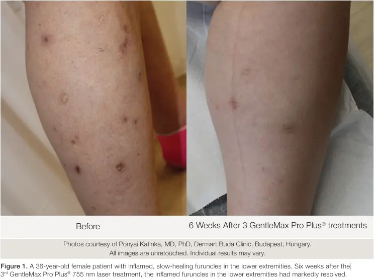The 755 nm alexand­rite laser prima­rily targets melanin (absor­bing chromop­hore) in hair follicles, making it an effec­tive tool for long-term hair reduc­tion. Similar to previous appli­ca­tions in chronic inflam­ma­tory skin condi­tions such as HS2, the GentleMax Pro Plus 755 nm laser hair removal treat­ment appeared to support impro­ve­ment in the subject’s furuncle-related lesions and overall skin condi­tion. Targe­ting the hair follicle may help reduce the factors that contri­bute to recur­rent furuncles or folli­cu­litis, as these condi­tions often begin with inflam­ma­tion in the follicle. Further studies may be needed to substan­tiate these results.