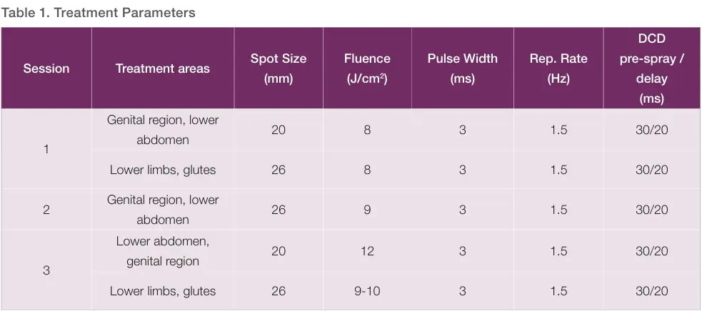 A 36-year-old female patient, with Fitzpat­rick Skin Type (FST) III, who is a smoker but with no serious illnesses in her medical history, presented with boils. The patient suffered from inflamed, slow-healing furuncles in the genital region, gluteal region, and lower extre­mi­ties since the age of 16 years, which healed with residual scarring. Prior to the develop­ment of furuncles, the subject experi­enced fever, chills, and malaise as prodromal symptoms. She had seen several derma­to­lo­gists and under­gone multiple 2‑to 3‑month cycles of systemic therapy of tetracyc­line, clindamycin, and isotre­ti­noin therapy. She experi­enced temporary impro­ve­ment, but her symptoms returned, even while taking the medica­tions. The patient also tried Octeni­sept® antiseptic solution (oktenidin-dihid­roklo­rid/­fen­oxi­e­tanol) for local external disin­fec­tion. Diagnoses and clinical exami­na­tions yielded negative ANA (antinuc­lear antibody) panel results, and routine labora­tory f indings showed no signi­fi­cant abnor­ma­li­ties. HIV, hepatitis, and syphilis serology revealed no notable findings. Chest X‑ray, abdominal ultra­sound, gyneco­logy, laryn­go­logy, and dentistry were all negative. General bacte­ri­o­log­ical and fungal cultures taken from the furuncle showed no patho­genic growth. Punch biopsy histo­logy indicated acute neutrop­hilic inflam­ma­tion. The patient was prescribed doxycyc­line antibiotic, vitamin D, and clindamycin gel topically. Despite temporary impro­ve­ment, her symptoms recurred. Biolog­ical therapy was considered within the frame­work of clinical exami­na­tion with a provi­si­onal diagnosis of HS, but due to atypical symptoms present on the legs, the patient could not be included in the trial. The subject received a series of 3 GentleMax Pro Plus® 755 nm laser treat­ments* (with 6‑week inter­vals between sessions) to the lower limbs, abdomen, genital area and buttock (Table 1). Before the proce­dure, the areas were evalu­ated and disin­fected with Octeni­sept®. Treat­ment was performed using a single pass except in areas of inflam­ma­tion or open lesions, where a single pulse was applied in the center followed by 4 – 5 pulses surrounding the lesion with 30 – 40% overlap. Epidermal cooling was applied using the Dynamic Cooling Device (DCD®) to protect the skin and enhance comfort with 30 ms duration and 20 ms delay (30÷20 ms). The clinical endpoint was perifol­li­cular edema and mild erythema around the hair follicles.